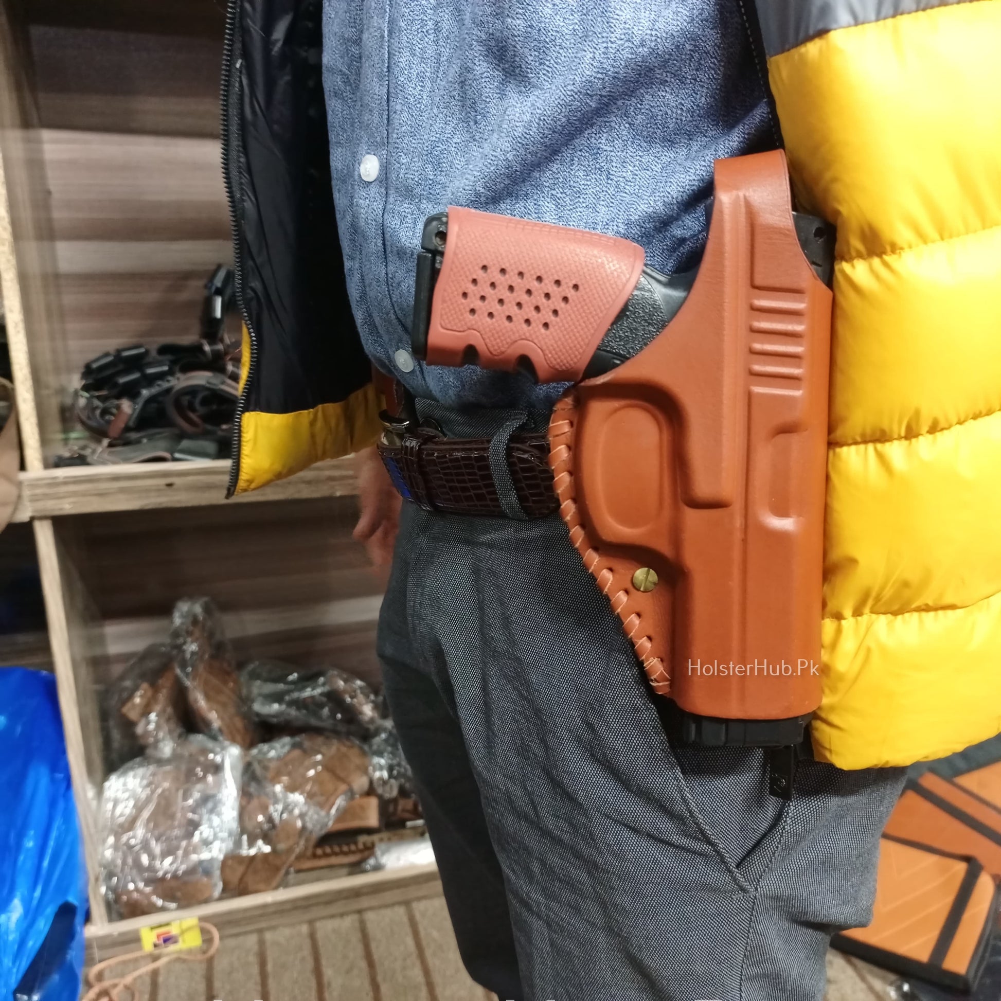 Introducing our Mold Holster for 9mm, crafted from premium pure leather – a perfect fusion of style and functionality. Designed for comfort and convenience, this holster seamlessly fits on your pant, belt, or shalwar. HOLSTER HUB proudly presents an elegant solution for discreetly carrying your essentials. Elevate your everyday carry with our meticulously crafted leather holsters, exclusively available for our Pakistani customers. Experience sophistication and practicality at HOLSTER HUB, where quality meets style.